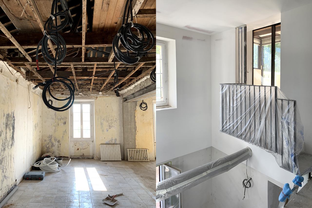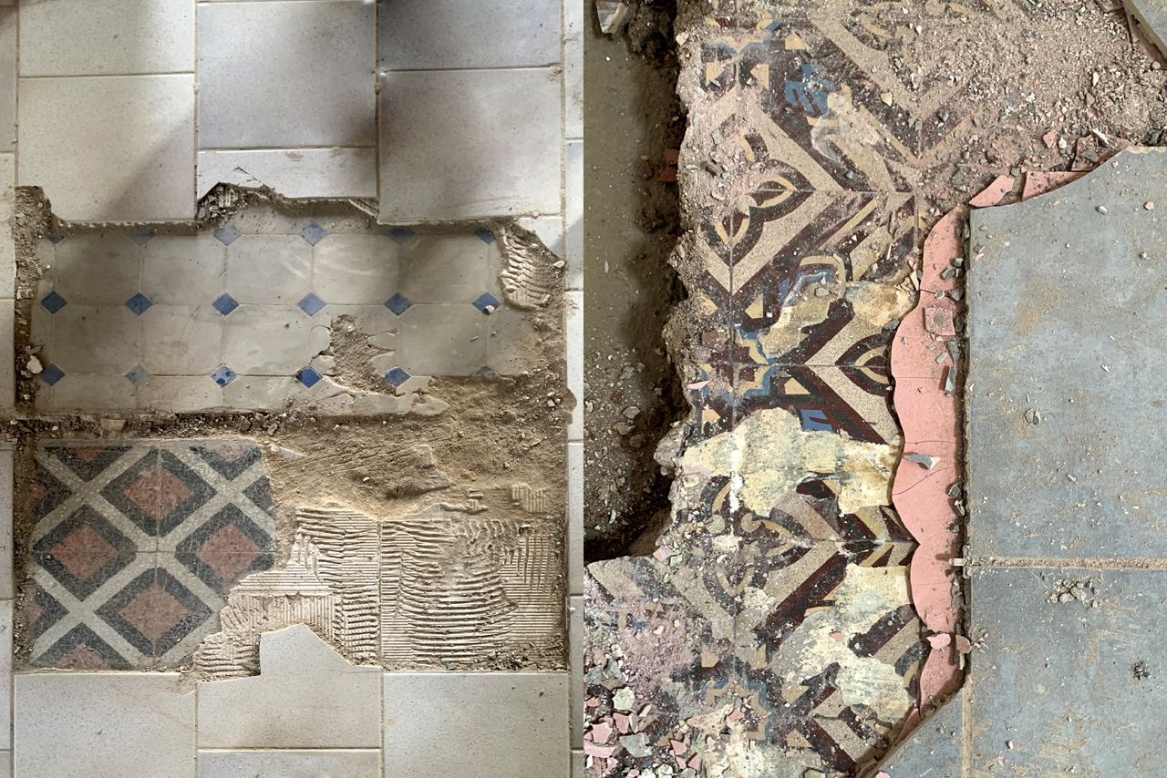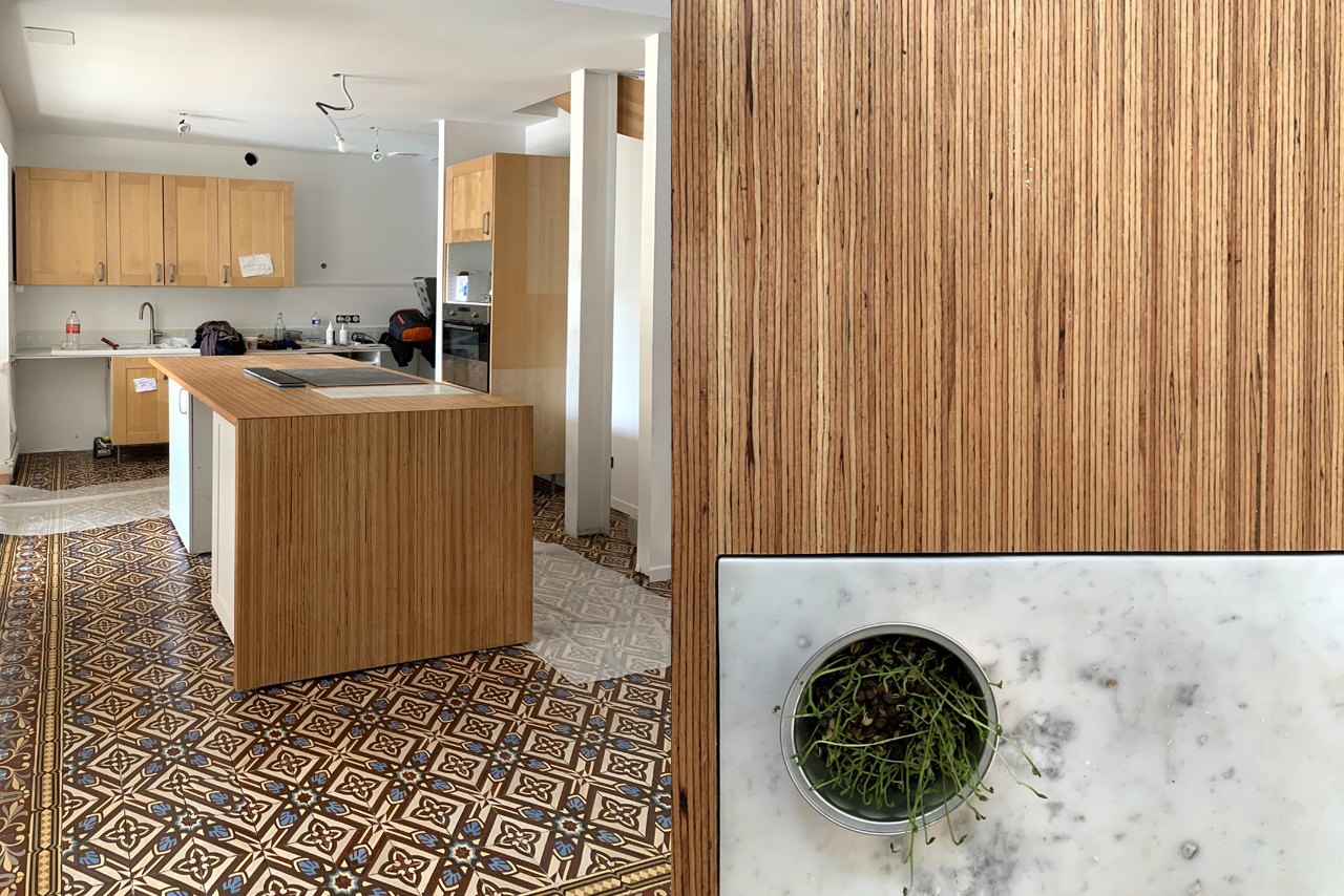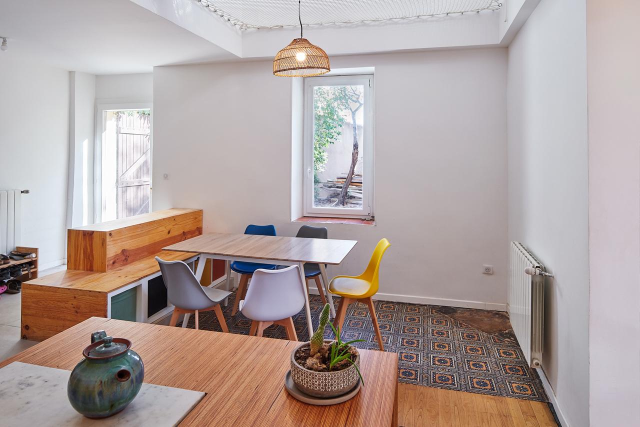 L’espace est magnifié par les carreaux de ciments existants, qui avaient été « protégés » par un carrelage pendant des années et que nous avons redécouverts pendant le chantier. Nettoyés, rénovés et traités, ces carreaux laissent leurs motifs et leurs couleurs accentuer l’importance des pièces de vie.