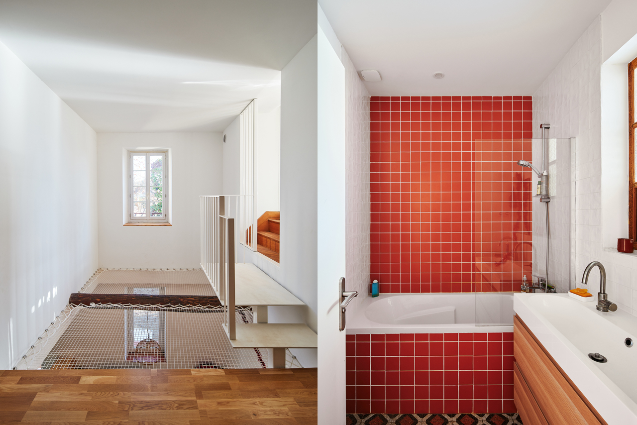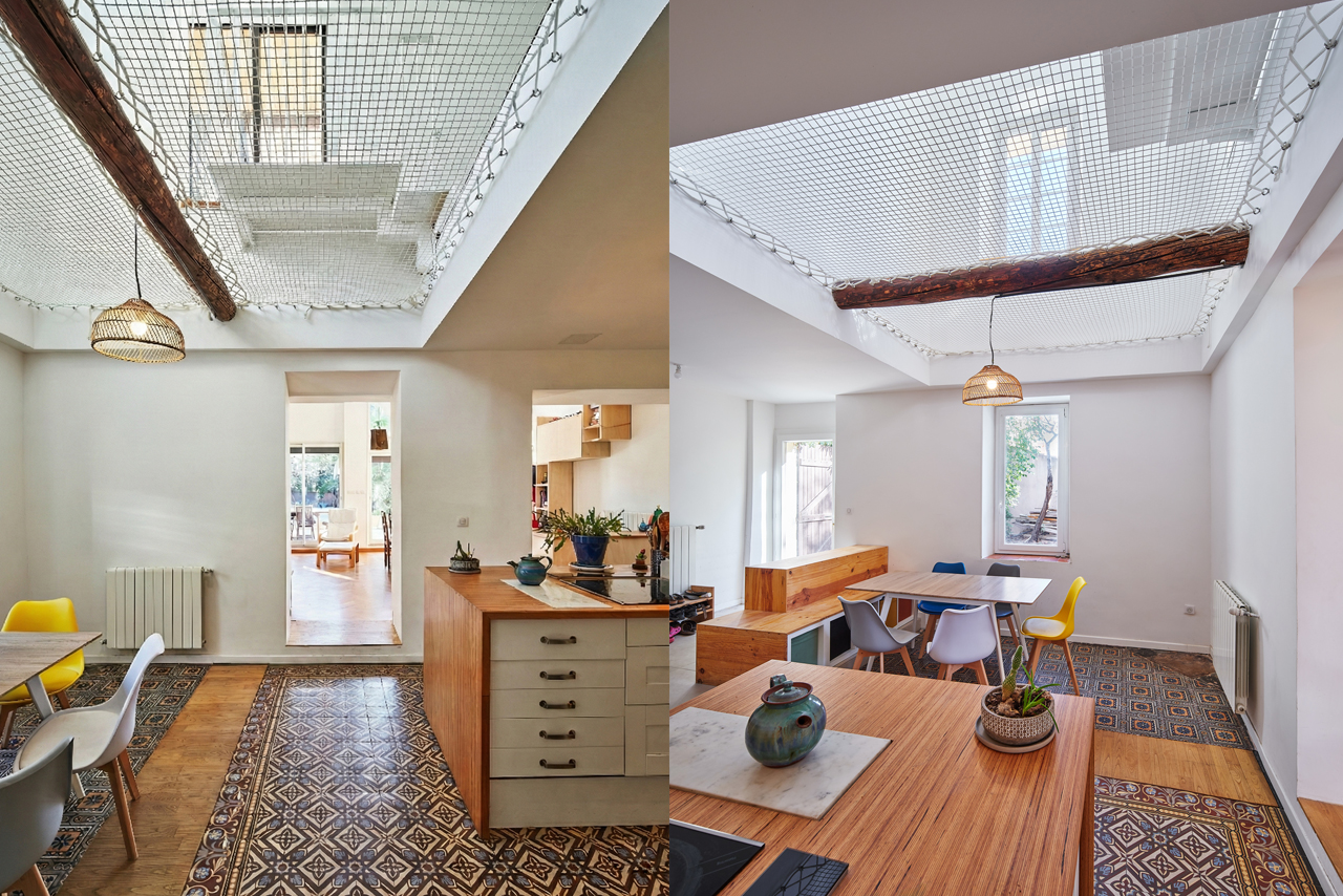 C’est autour du filet placé dans la double hauteur qui a été créée pour rejoindre les deux appartements que les espaces de vie s’organisent. Au rez-de-chaussée, la salle-à-manger et la cuisine. A l’étage, la salle de jeux.